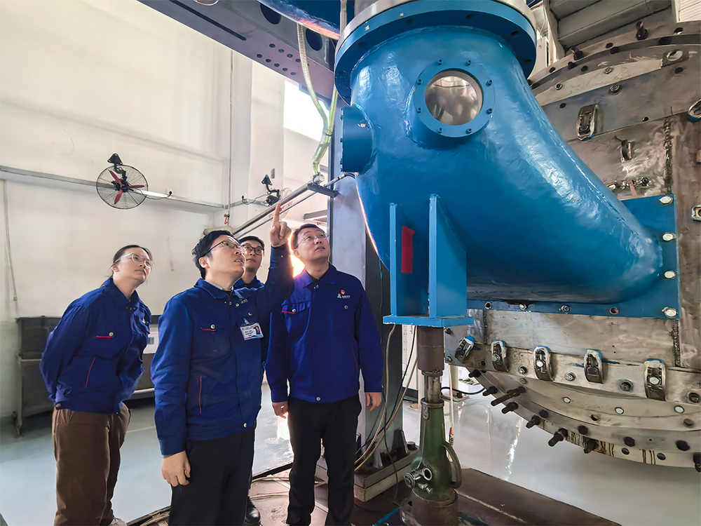 整个过程中,机组过流部件都承受着超高的压力。天台项目水轮机结构主任设计师曲扬介绍道:“当天台机组的水泵水轮机全速运转时,水流冲击部件表面的瞬时压力,相当于在指甲盖大小的面积上站立两个成年人的重量。”这种极端环境对机组的材料强度、结构稳定性提出了近乎极限的要求。
