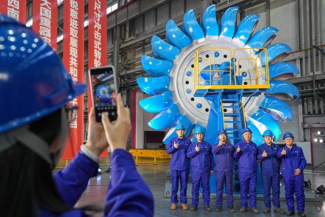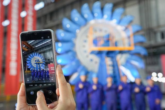 12月30日,在哈电集团哈尔滨电机厂有限责任公司生产车间,工作人员在冲击式水轮机转轮前合影留念。新华社记者 王建威 摄