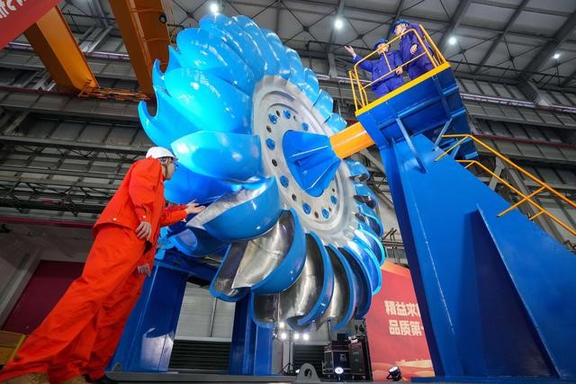 12月30日,在哈电集团哈尔滨电机厂有限责任公司生产车间,工作人员在检查冲击式水轮机转轮焊接质量。新华社记者 王建威 摄