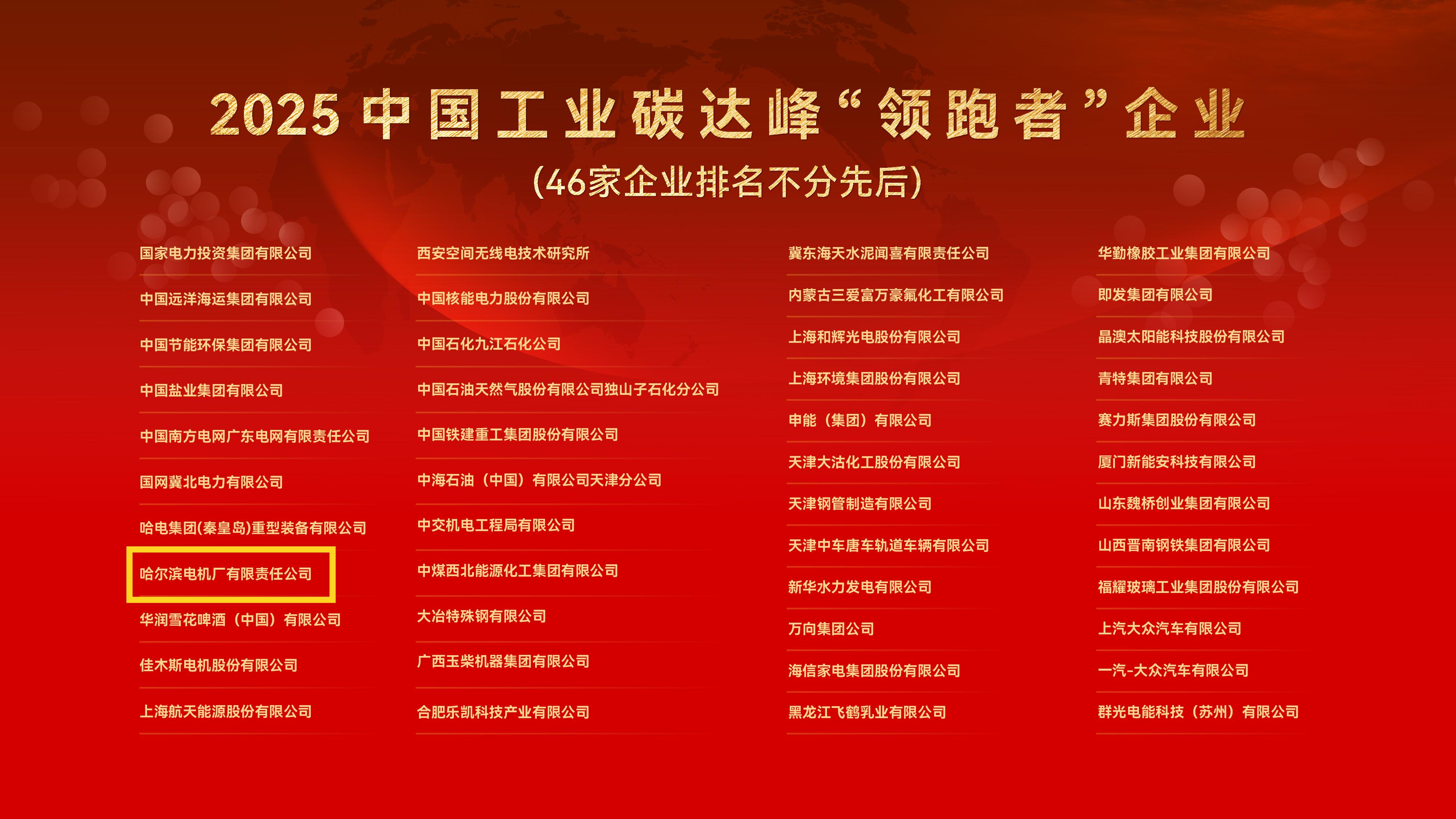 2025年12月27号,第四届中国工业碳达峰论坛在山东青岛举行,中国工业经济联合会发布2025年度中国工业碳达峰“领跑者”企业名单。哈电集团哈尔滨电机厂有限责任公司凭借行业先进技术创新赋能、绿色低碳能源利用和数字化节能降碳领域的卓越表现成功入选。