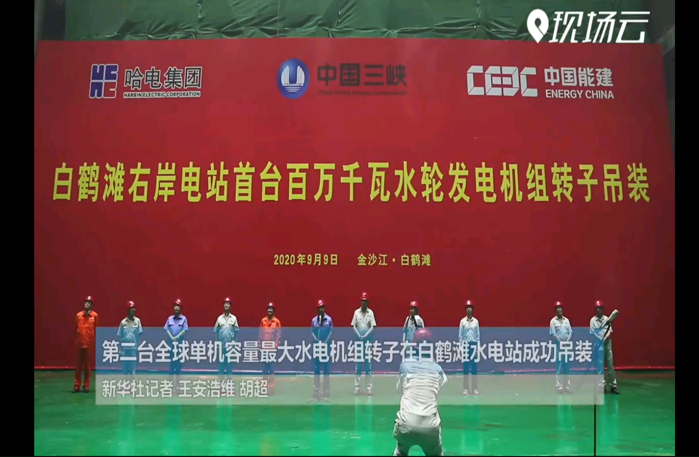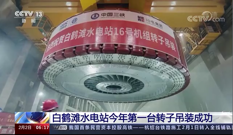 新华丝路视频 白鹤滩右岸电站首台百万千瓦水轮发电机组转子吊装