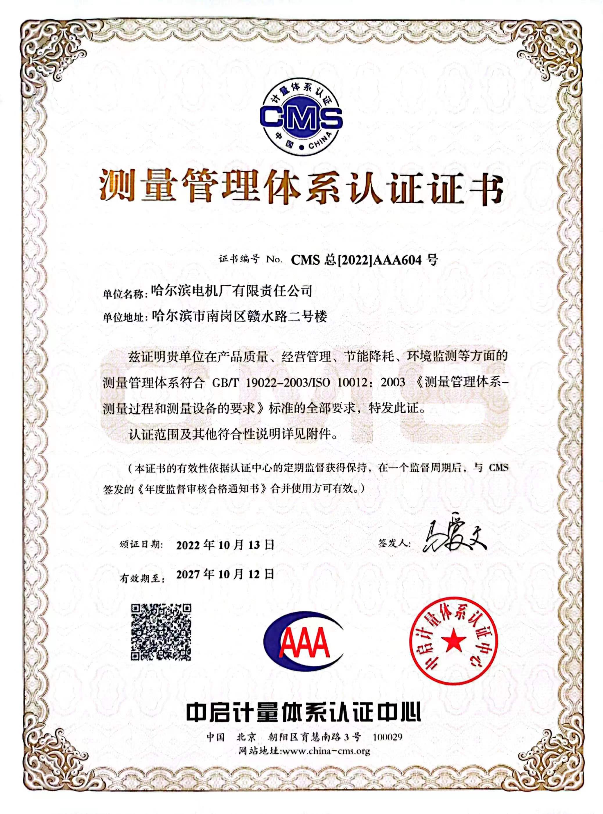 测量管理体系认证证书