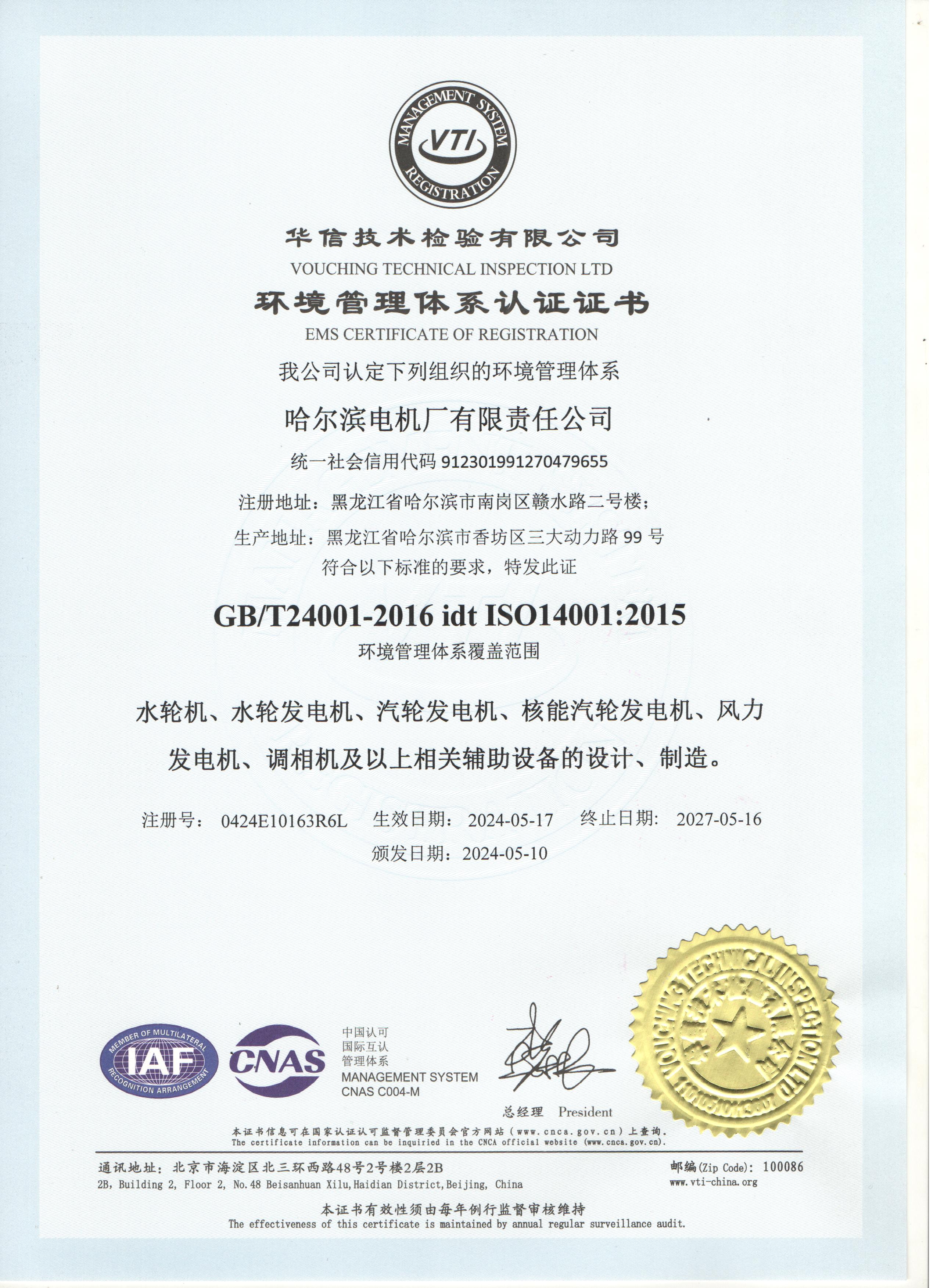 环境管理体系认证证书