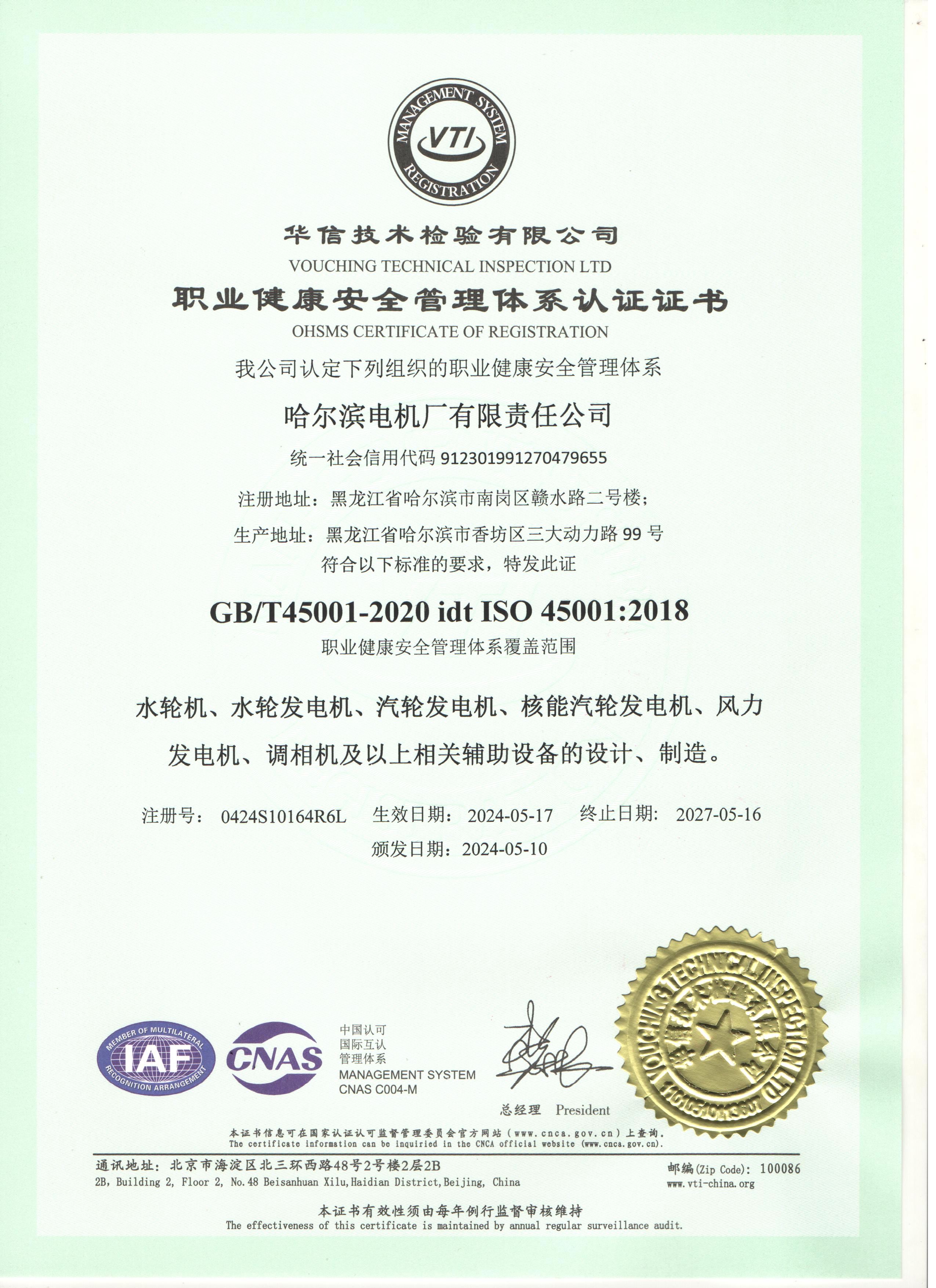 职业健康安全管理体系认证证书